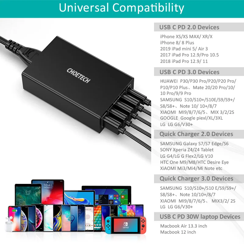 Best Seller CHOETECH Power Delivery USB-C PD Charger 60W 5-Port With QC3.0 USB Wall Charger For Samsung For Xia