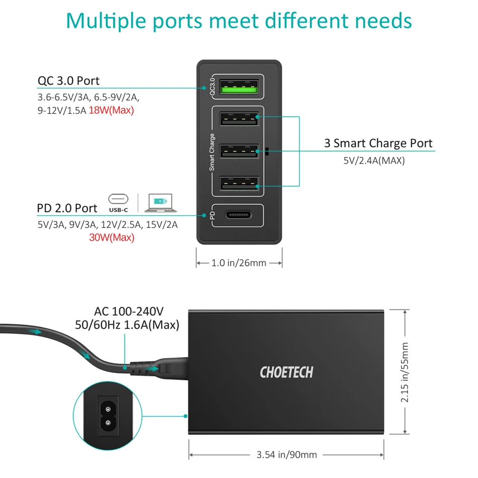 Best Deal CHOETECH Power Delivery USB-C PD Charger 60W 5-Port With QC3.0 USB Wall Charger For Samsung For Xia