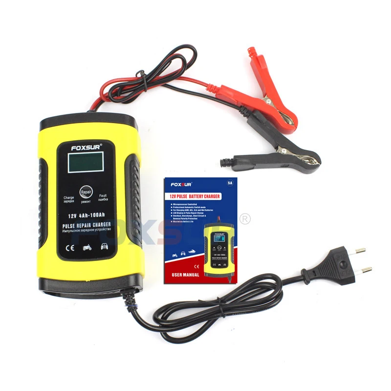 Hot Sale FOXSUR 12V 5A Pulse Repair Charger with LCD Display Motorcycle & Car Battery Charger 12V AGM GEL WE